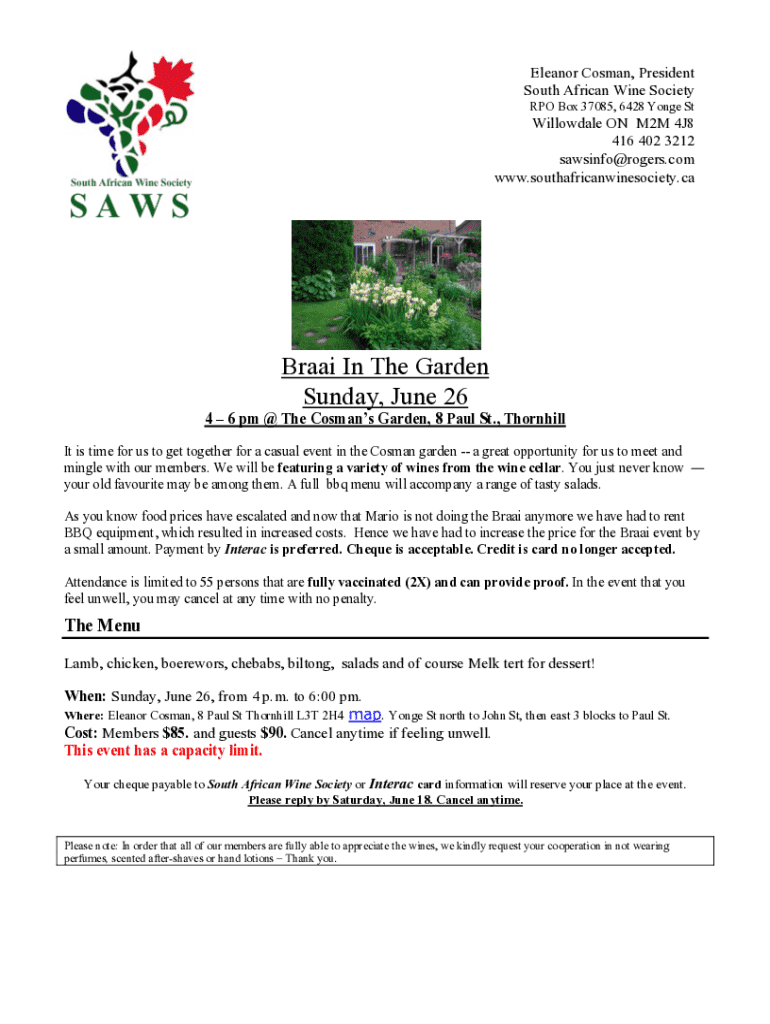 Join the South African Wine Society for a summer Brain. Enjoy a BBQ feast and a variety of wines on June 26, 2023. Limited capacity, RSVP required.