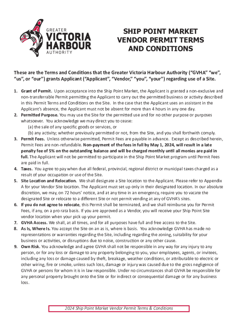 SHIP POINT MARKET VENDOR PERMIT TERMS AND CONDITIONS These are the Terms and Conditions that the Greater Victoria Harbor Authority (GHA we, us, or our) grants Applicant (Applicant, Vendor, you, your)