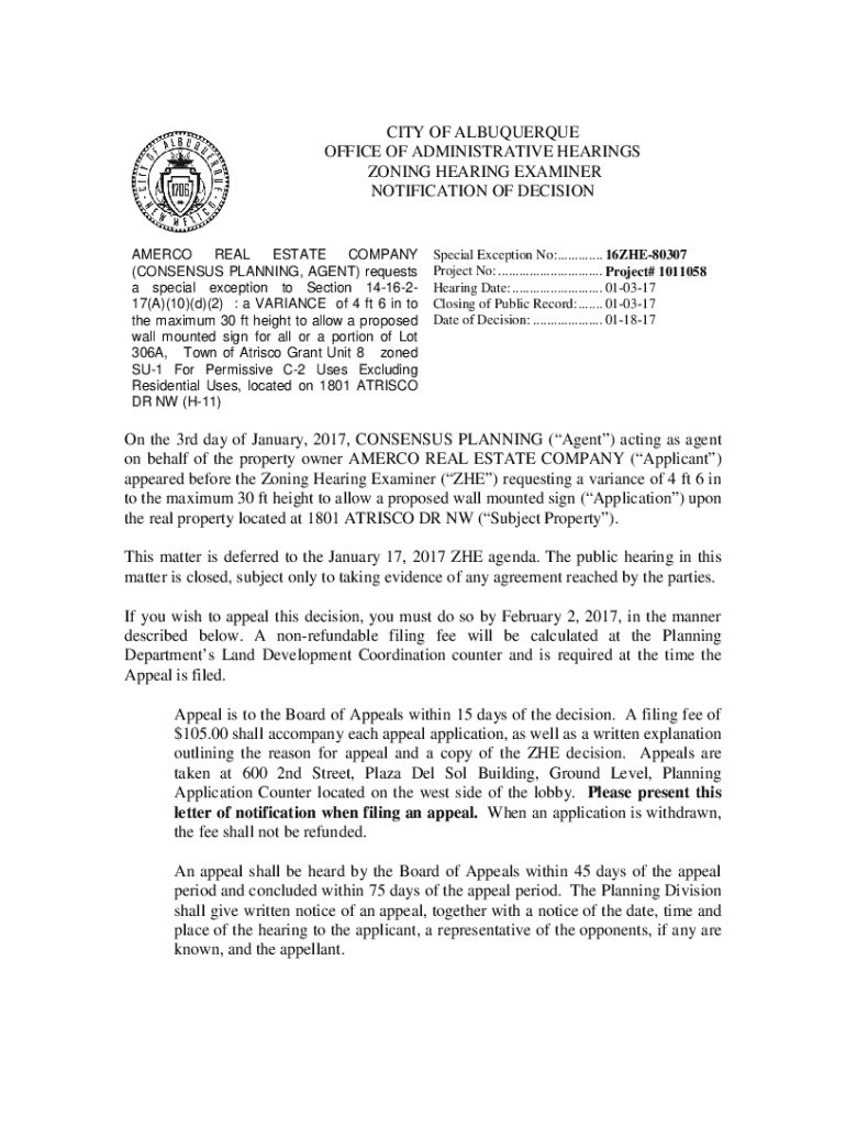 CITY OF ALBUQUERQUE OFFICE OF ADMINISTRATIVE HEARINGS ZONING HEARING EXAMINER NOTIFICATION OF DECISIONAMERCO REAL ESTATE COMPANY (CONSENSUS PLANNING, AGENT) requests a special exception to Section
