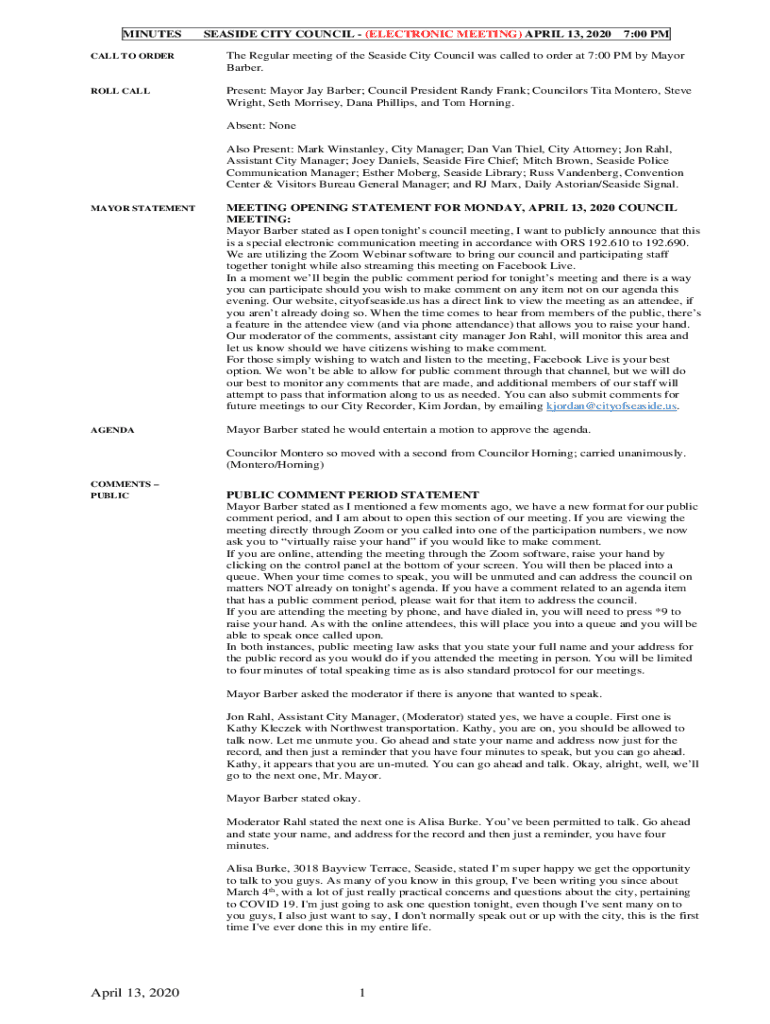 MINUTESSEASIDE CITY COUNCIL (ELECTRONIC MEETING) APRIL 13, 20207:00 PMC ALL TO Order Regular meeting of the Seaside City Council was called to order at 7:00 PM by Mayor