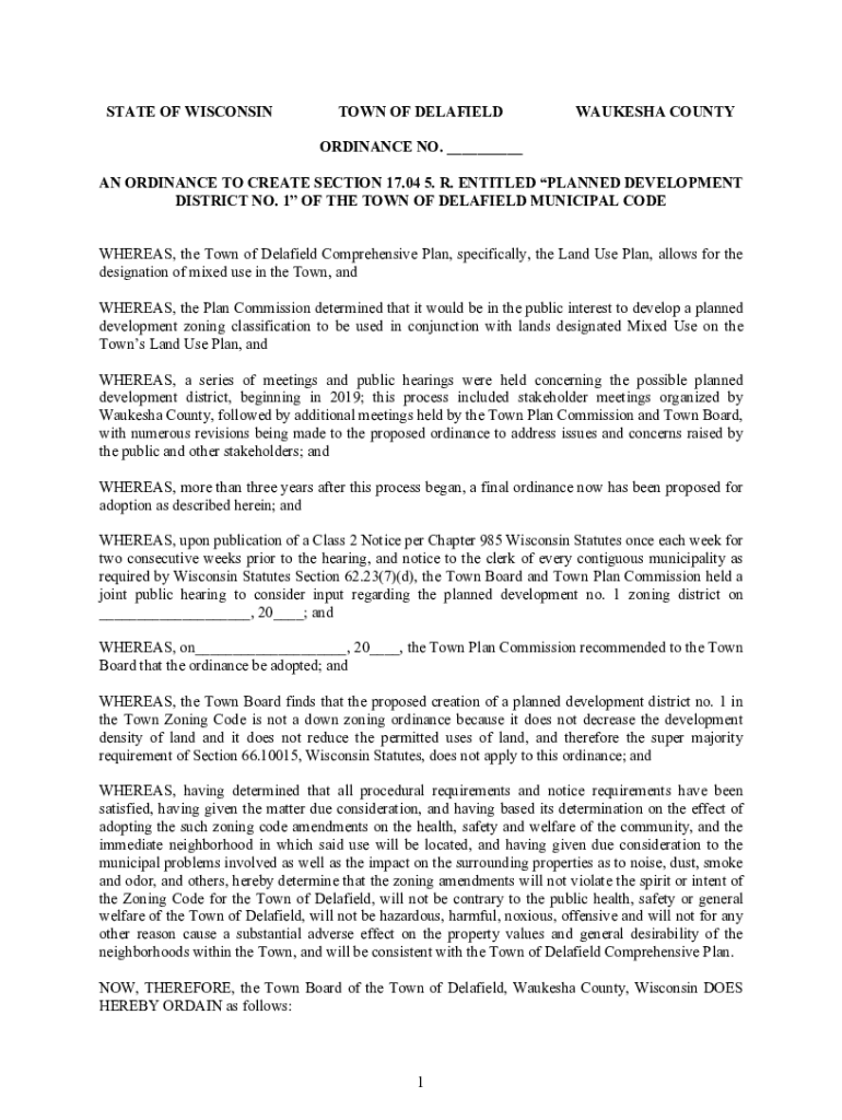 This ordinance creates Planned Development District No. 1 in Del afield, Wisconsin, providing guidelines for zoning and development of a mixed-use neighborhood.
