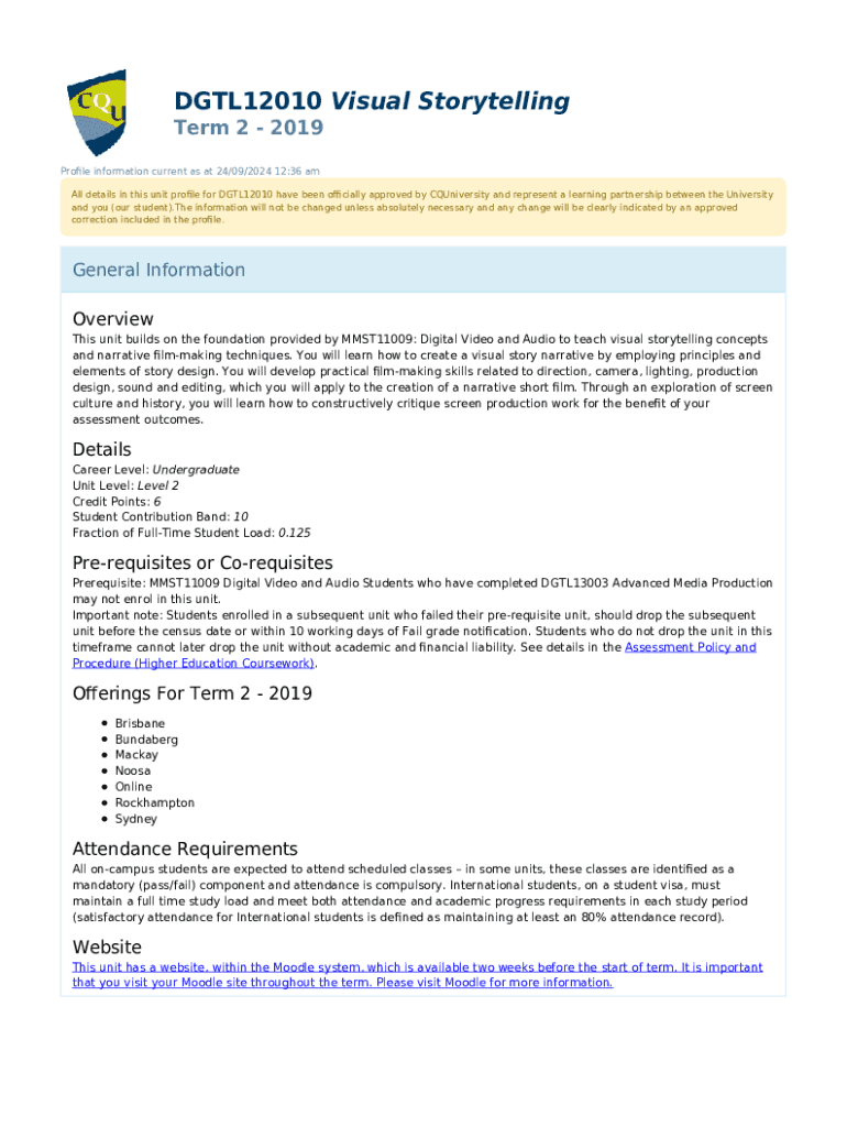 DGTL12010 Visual Storytelling Term 2 2019 Prole information current as at 24/09/2024 12:36 am All details in this unit prole for DGTL12010 have been socially approved by University and represent a