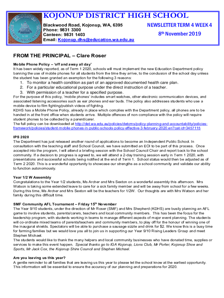 Email: Kojonup.dhs@education.wa.edu.auNEWSLETTER TERM 4 WEEK 4