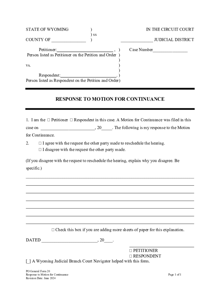 STATE OF WYOMING COUNTY OF ___) ) ss )Petitioner: , ) Person listed as Petitioner on the Petition and Order ) ) vs. ) ) Respondent: .) Person listed as Respondent on the Petition and Order)IN THE