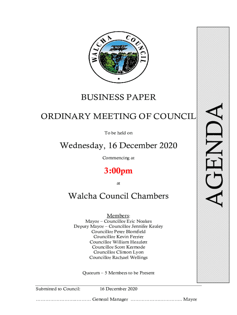 ORDINARY MEETING OF COUNCIL To be held onWednesday, 16 December 2020 Commencing at3:00pm atWalcha Council Chambers Members: Mayor Councillor Eric Noakes Deputy Mayor Councillor Jennifer Kealey Councillor