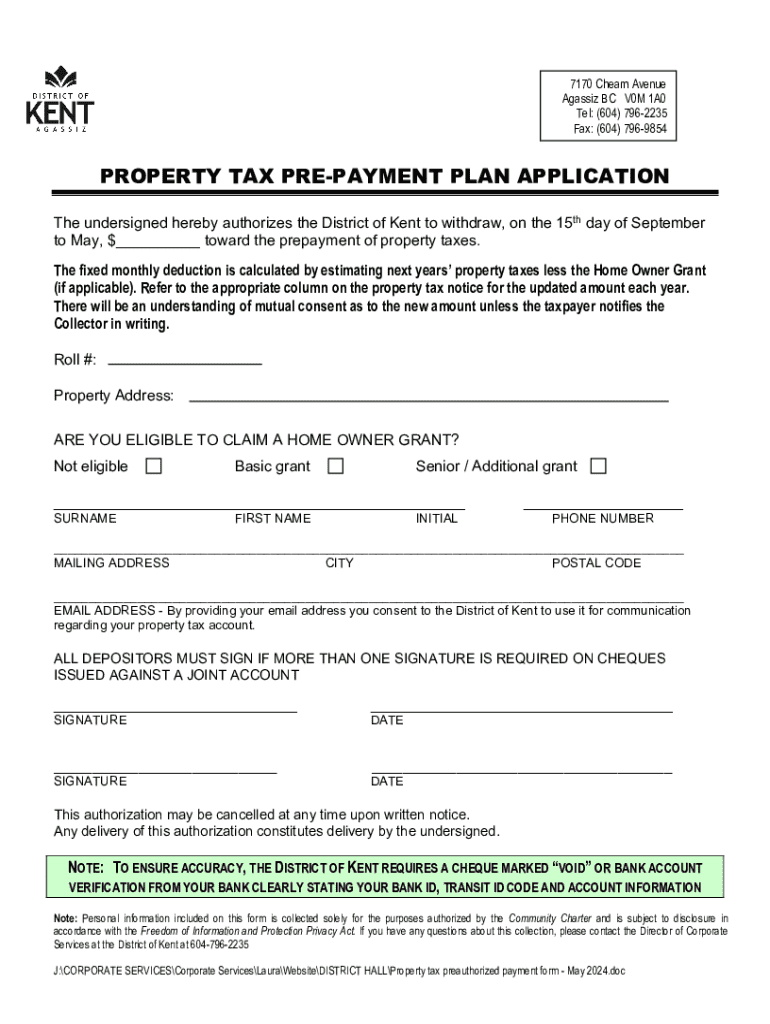 7170 Cheam Avenue Agassiz BC V0M 1A0 Tel: (604) 7962235 Fax: (604) 7969854PROPERTY TAX PREPAYMENT PLAN APPLICATION The undersigned hereby authorizes the District of Kent to withdraw, on the 15th day