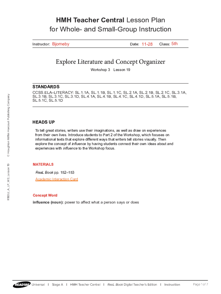 HMH Teacher Central Lesson Plan for Whole and SmallGroup Instruction Instructor:BjornebyDate:1128Class:5thExplore Literature and Concept Organizer Workshop 3Lesson 19R180U_A_LP_W3_Lesson 19 Houghton