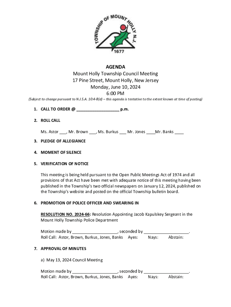 AGENDA Mount Holly Township Council Meeting 17 Pine Street, Mount Holly, New Jersey Monday, June 10, 2024 6:00 PM (Subject to change pursuant to N.J.S.A. 10:48(d) this agenda is tentative to the extent