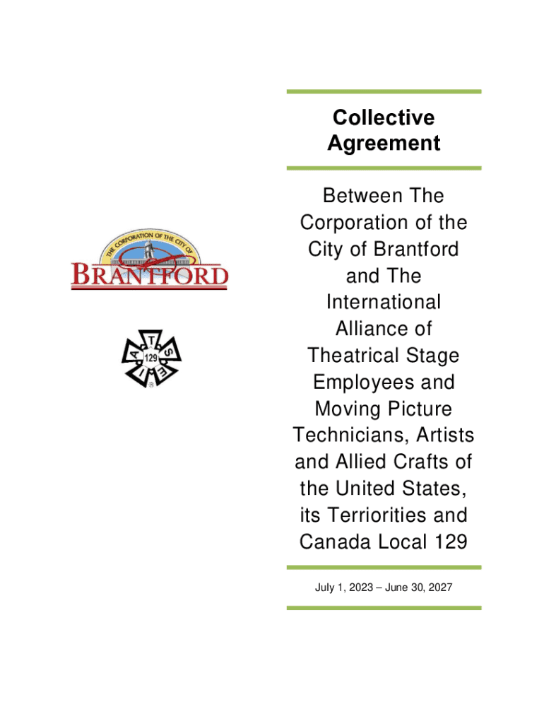 This document outlines the Collective Agreement between the City of Brantford and IA TSE Local 129, detailing employment conditions, rates of pay, and grievance procedures for stage employees from July 1, 2023, to June 30, 2027.