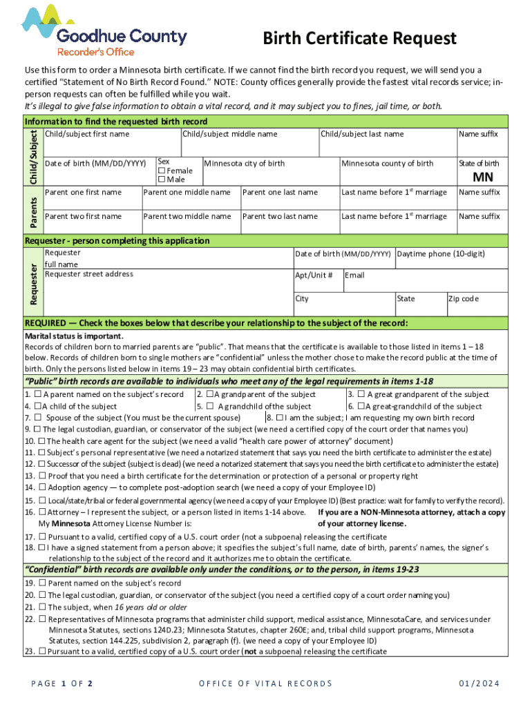 Use this form to order a Minnesota birth certificate. If we cannot find the birth record you request, we will send you a