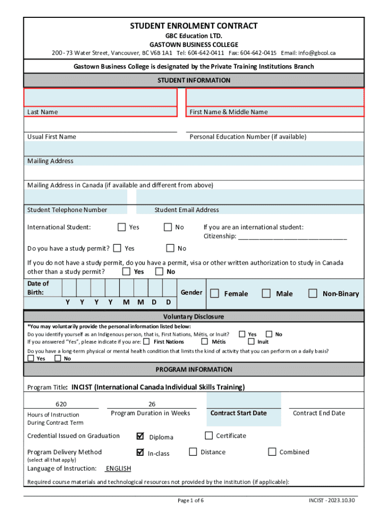 This Student Enrollment Contract outlines the terms for the INSIST program at Gas town Business College, detailing requirements, costs, and refund policies.