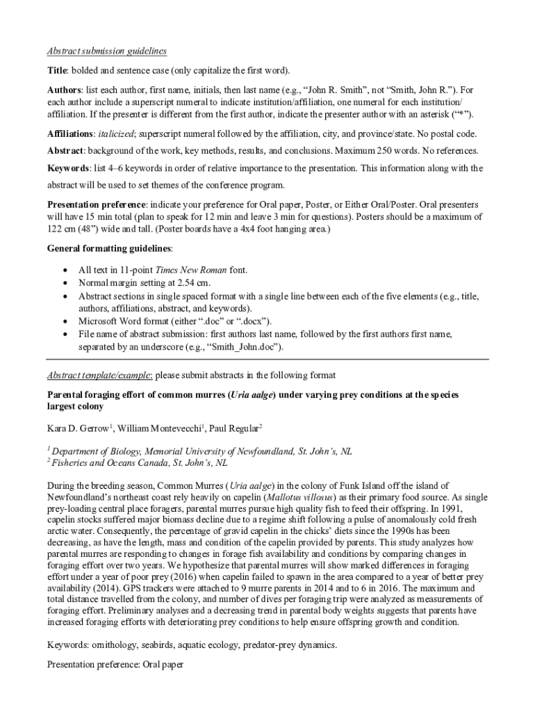 Abstract submission guidelines Title: bolded and sentence case (only capitalize the first word). Authors: list each author, first name, initials, then last name (e.g., John R. Smith, not Smith, John