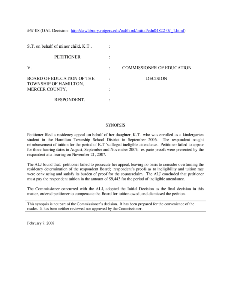 #6708 (OAL Decision: http://lawlibrary.rutgers.edu/oal/html/initial/edu0482207_1.html)S.T. on behalf of minor child, K.T., PETITIONER, : :V.:COMMISSIONER OF EDUCATIONBOARD OF EDUCATION OF THE TOWNSHIP