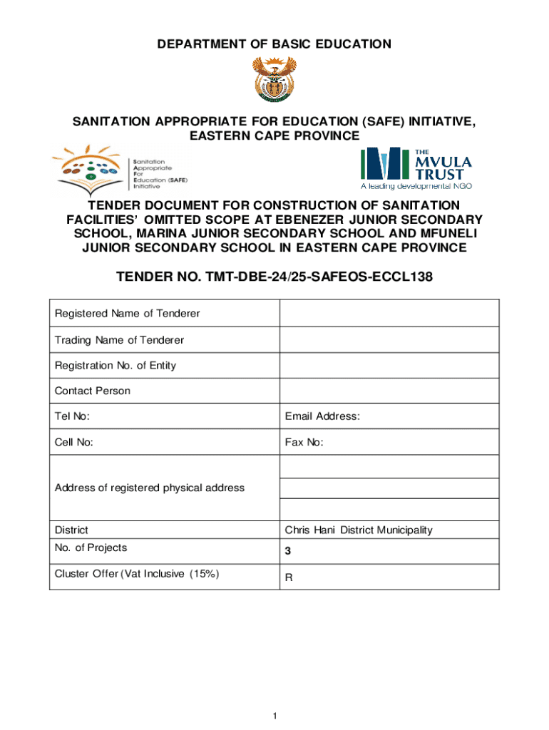 EASTERN CAPE PROVINCETENDER DOCUMENT FOR CONSTRUCTION OF SANITATION