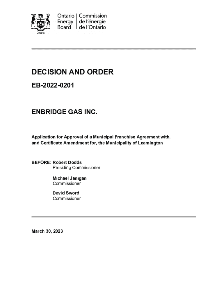DECISION AND ORDER EB20220201 ENBRIDGE GAS INC.Application for Approval of a Municipal Franchise Agreement with, and Certificate Amendment for, the Municipality of LeamingtonBEFORE: Robert Dodds Presiding