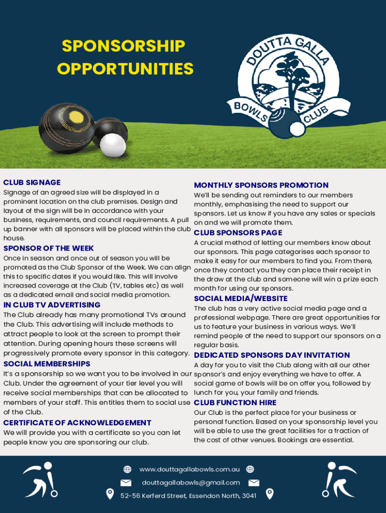 SPONSORSHIP OPPORTUNITIESCLUB SIGNAGE Signage of an agreed size will be displayed in a prominent location on the club premises. Design and layout of the sign will be in accordance with your business,
