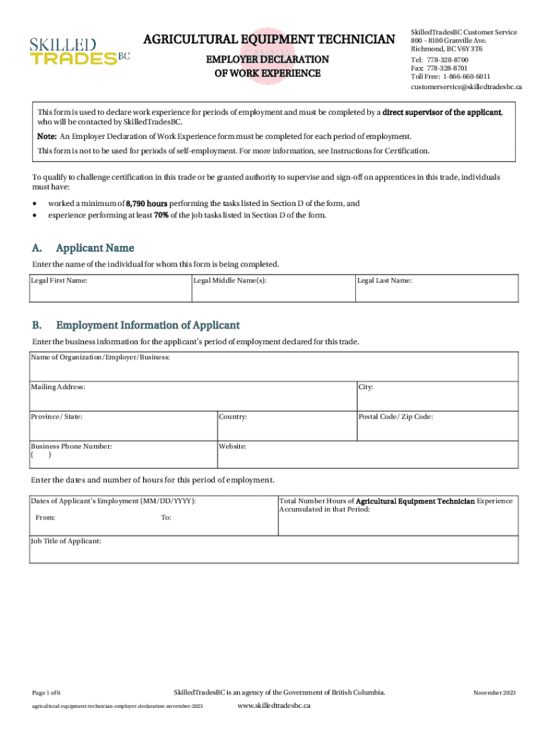AGRICULTURAL EQUIPMENT TECHNICIAN EMPLOYER DECLARATION OF WORK EXPERIENCESkilledTradesBC Customer Service 800 8100 Granville Ave. Richmond, BC V6Y 3T6 Tel: 7783288700 Fax: 7783288701 Toll Free: 18666606011