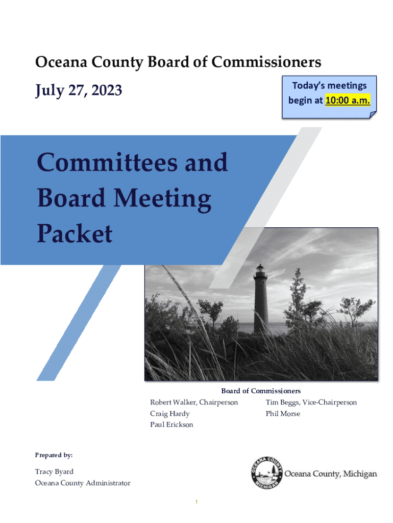 This document outlines the agenda and details for the Oceana County Board of Commissioners meeting held on July 27, 2023, including meeting times, committee reports, and public notices.