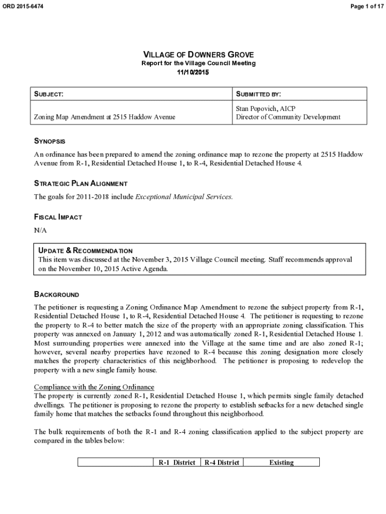ORD 20156474Page 1 of 17VILLAGE OF DOWNERS GROVE Report for the Village Council Meeting 11/10/2015SUBJECT:SUBMITTED BY:Zoning Map Amendment at 2515 Haddow AvenueStan Popovich, AICP Director of Community