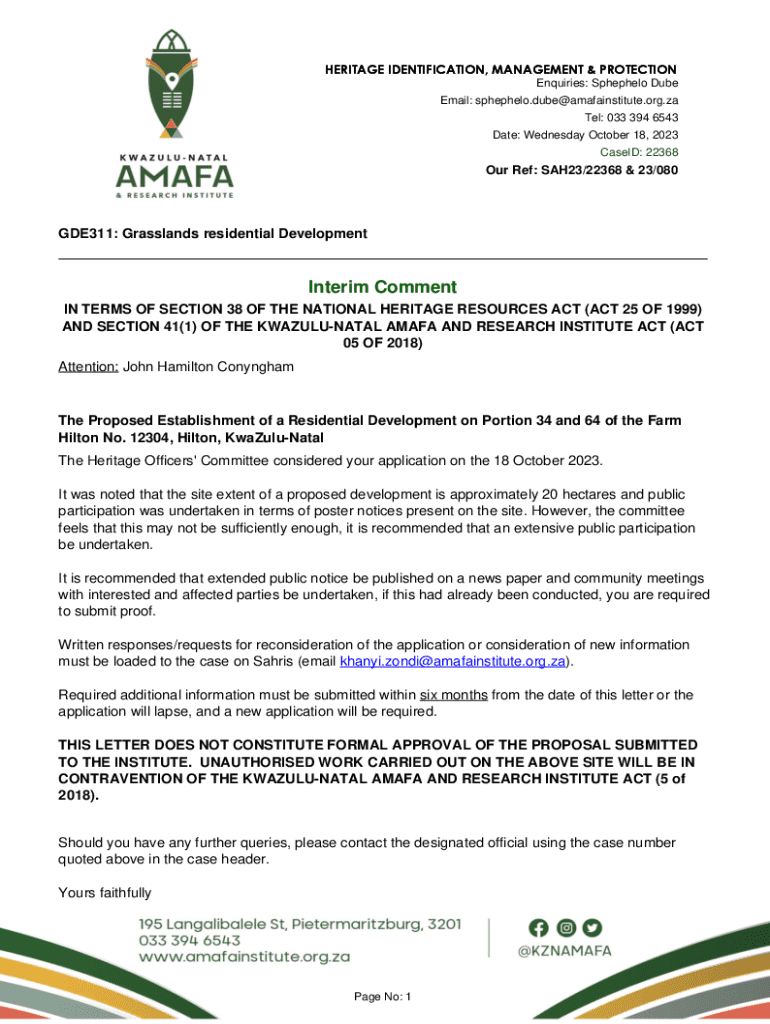HERITAGE IDENTIFICATION, MANAGEMENT & PROTECTION Inquiries: Shepherd Due Email: sphephelo.dube@amafainstitute.org.za Tel: 033 394 6543 Date: Wednesday, October 18, 2023, Cased: 22368Our Ref: SAH23/22368