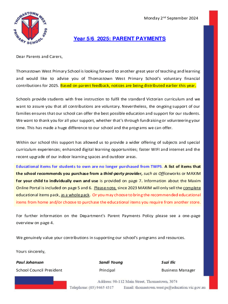 Monday 2nd September 2024Year 5/6 2025: PARENT PAYMENTSDear Parents and Carers,