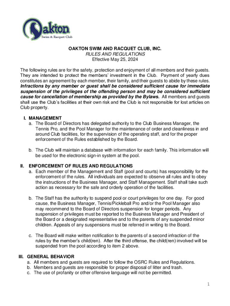 OAKTON SWIM AND RACQUET CLUB, INC. RULES AND REGULATIONS Effective May 25, 2024, The following rules are for the safety, protection and enjoyment of all members and their guests. They are intended