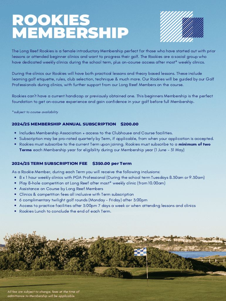 Join the Long Reef Rookies for a female beginner golf membership. Enjoy weekly clinics, on-course access, and much more. Perfect for new golfers!