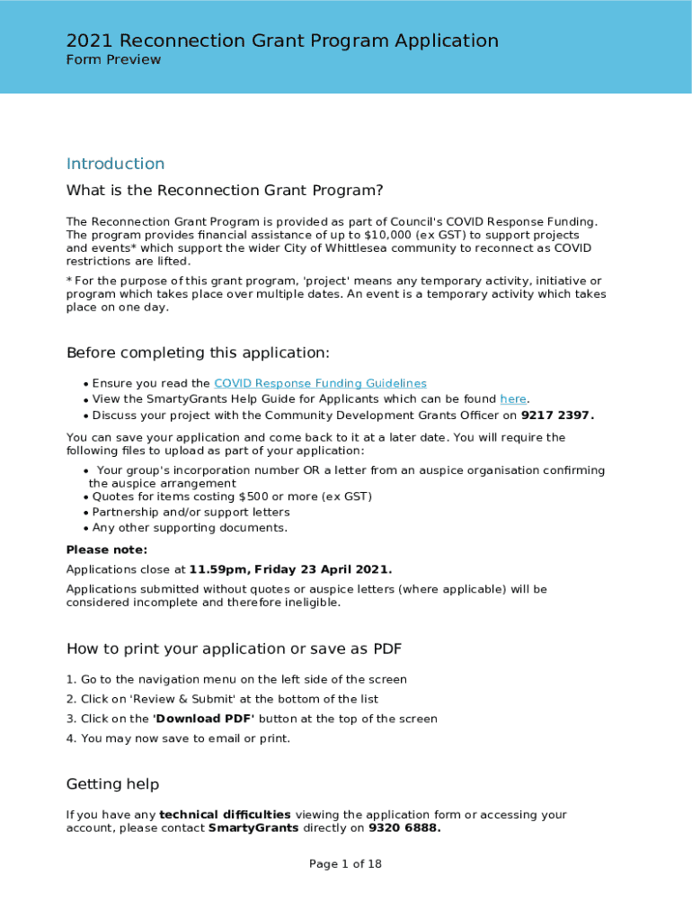 2021 Reconnection Grant Program Application Form PreviewIntroduction What is the Reconnection Grant Program? The Reconnection Grant Program is provided as part of Council\'s COVID-19 Response Funding.