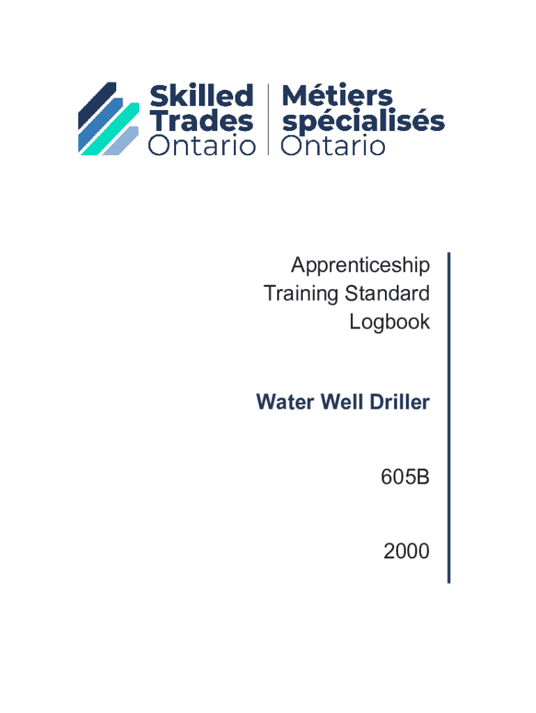 This logbook serves as an official training record for apprentices in Ontario\'s Water Well Driller trade, promoting skill development and competency verification.