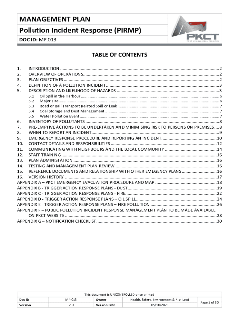 MANAGEMENT PLAN Pollution Incident Response (PIRMP) DOC ID: MP.013TABLE OF CONTENTS 1. 2. 3. 4. 5.INTRODUCTION ....................................................................................................................................