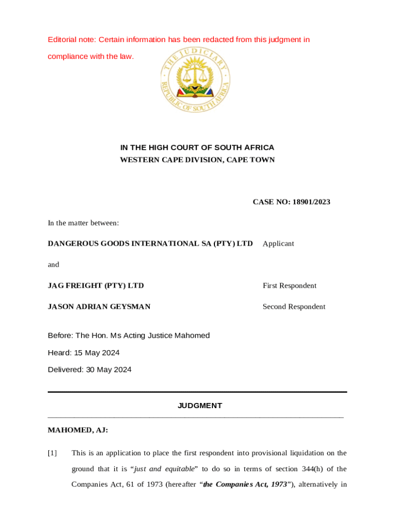 Editorial note: Certain information has been redacted from this judgment in compliance with the law.IN THE HIGH COURT OF SOUTH AFRICA WESTERN CAPE DIVISION, CAPE TOWNCASE NO: 18901/2023 In the matter