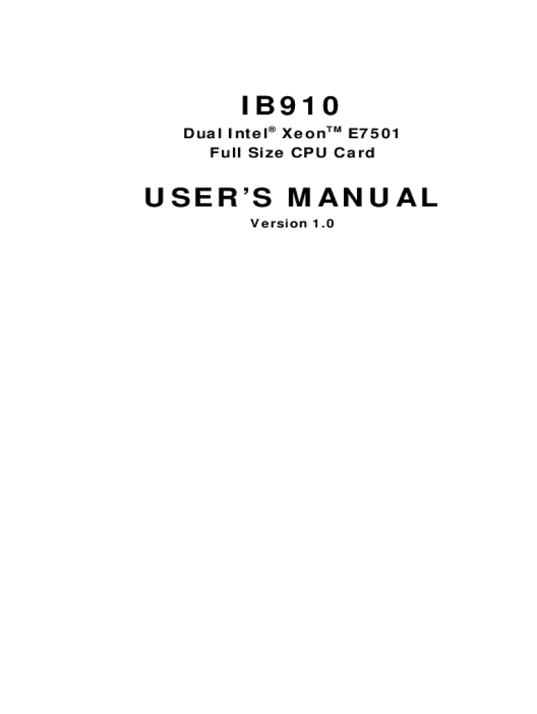IB910Dual Intel Sent E7501 Full Size CPU Carousers MANUAL Version 1.0Acknowledgments Award is a registered trademark of Award Software International, Inc. PS/2 is a trademark of International Business