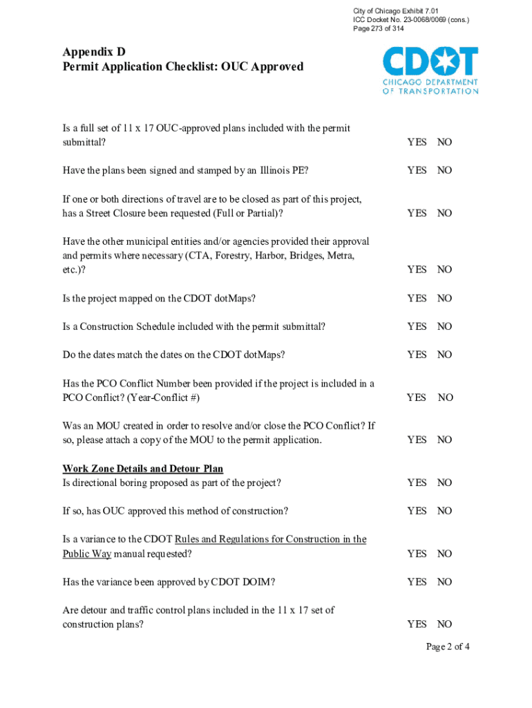 City of Chicago Exhibit 7.01 ICC Docket No. 230068/0069 (cons.) Page 273 of 314Appendix D Permit Application Checklist: OUT Approved a full set of 11 × 17 Unapproved plans included with the permit
