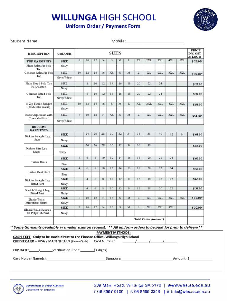 WILLUNGA HIGH SCHOOL Uniform Order / Payment FormStudent Name: ___ Mobile: ___ SIZESPRICE INC GST & LOGODESCRIPTIONCOLOURTOP GARMENTS Plain Relax Fit Polo Top Contrast Relax Fit Polo TopSIZE Navy8101214SMLXL2XL3XL4XL5XLSIZE10121416XSSMLXL2XL3XL5XL81012141618202224$