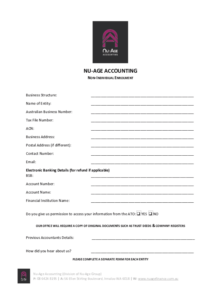 Complete the Nu-Age Accounting Non-Individual Enrollment Form to register your entity, providing essential details such as ABN, TEN, and banking information.
