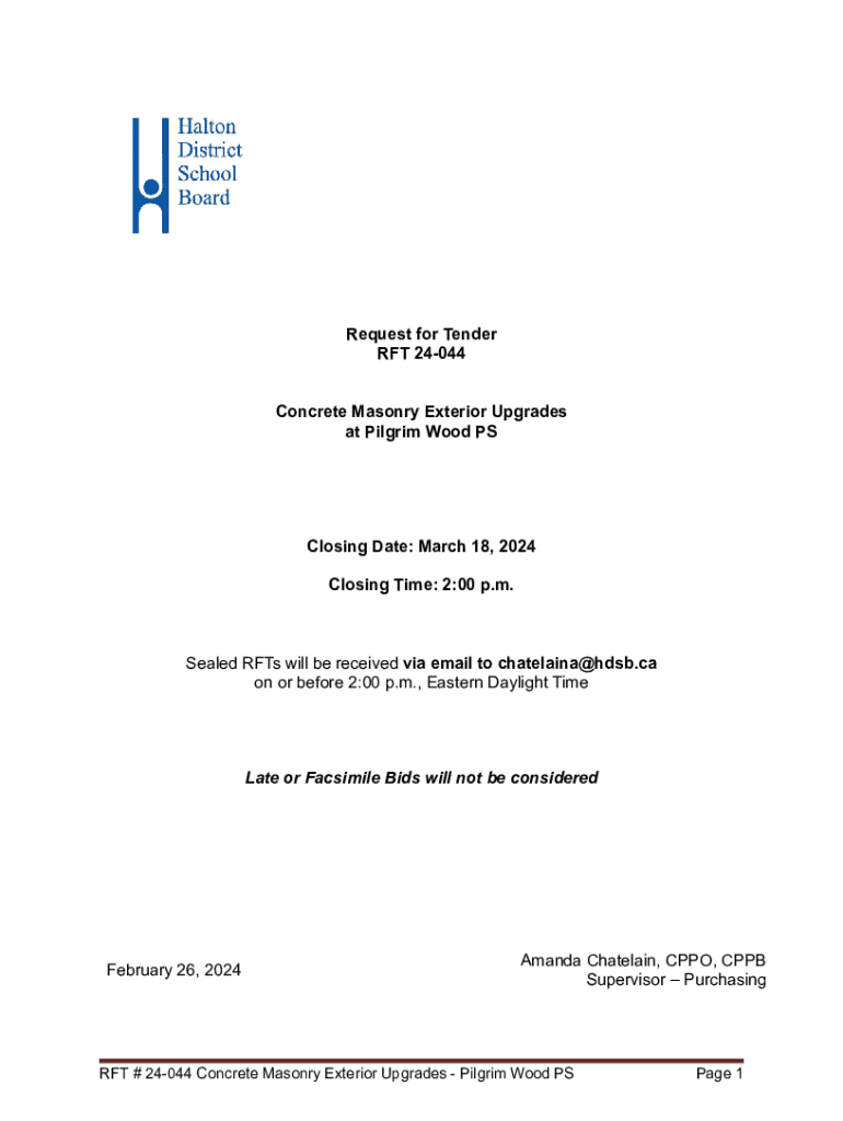 Request for Tender RFT 24044 Concrete Masonry Exterior Upgrades at Pilgrim Wood PSClosing Date: March 18, 2024 Closing Time: 2:00 p.m.Sealed RFTs will be received via email to chatelaina@hdsb.ca on