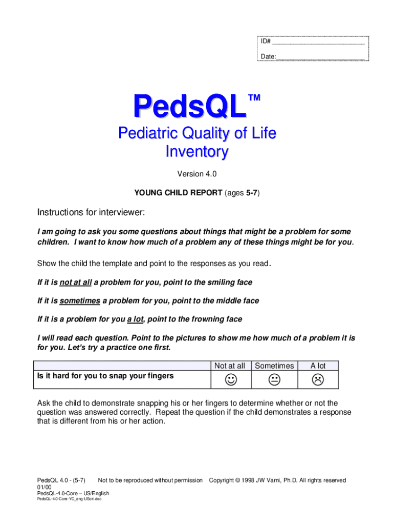 ID# ___ Date:___PedsQLPediatric Quality of Life Inventory Version 4.0 YOUNG CHILD REPORT (ages 57)Instructions for interviewer: I am going to ask you some questions about things that might be a problem