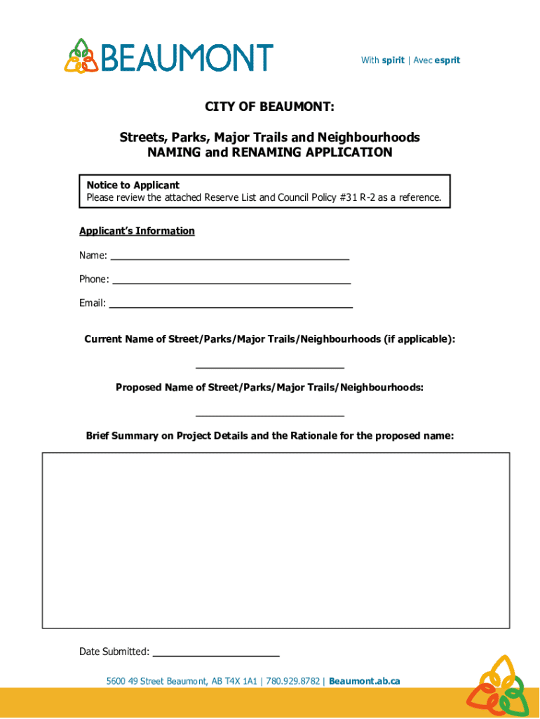 With spirit | Alec espritCITY OF BEAUMONT: Streets, Parks, Major Trails and Neighborhoods NAMING and RENAMING APPLICATION Notice to Applicant Please review the attached Reserve List and Council Policy