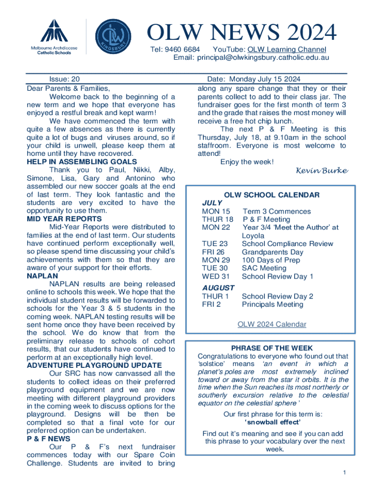 OLD NEWS 2024 Tel: 9460 6684 YouTube: OLD Learning Channel Email: principal@olwkingsbury.catholic.edu.au Issue: 20 Dear Parents & Families, Welcome back to the beginning of a new term, and we hope