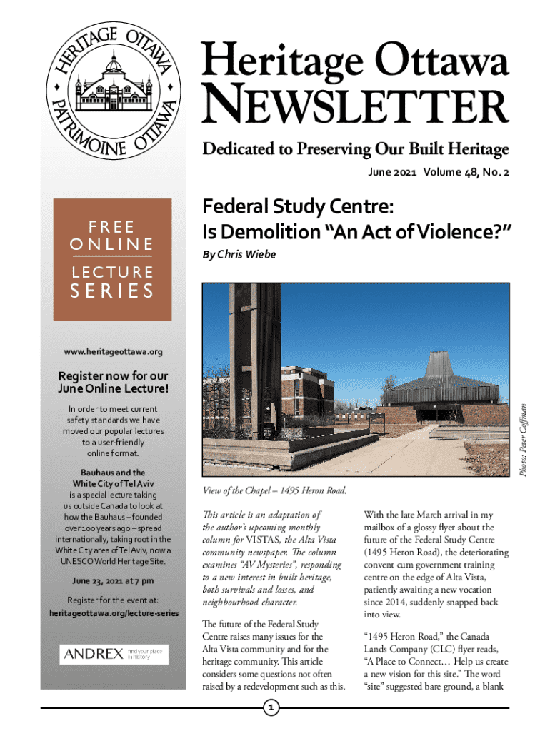 Dedicated to Preserving Our Built Heritage June 2021 Volume 48, No. 2FREE ONLINEFederal Study Centre: Is Demolition An Act of Violence? By Chris WiebeLECTURESERIES www.heritageottawa.orgRegister now