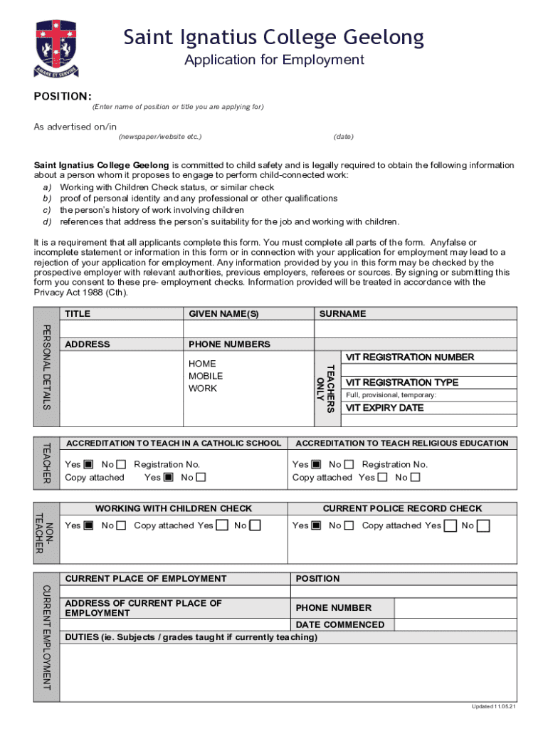 Saint Ignatius College Geelong seeks applicants for child-connected work. Complete the employment application form to ensure compliance with child safety regulations.
