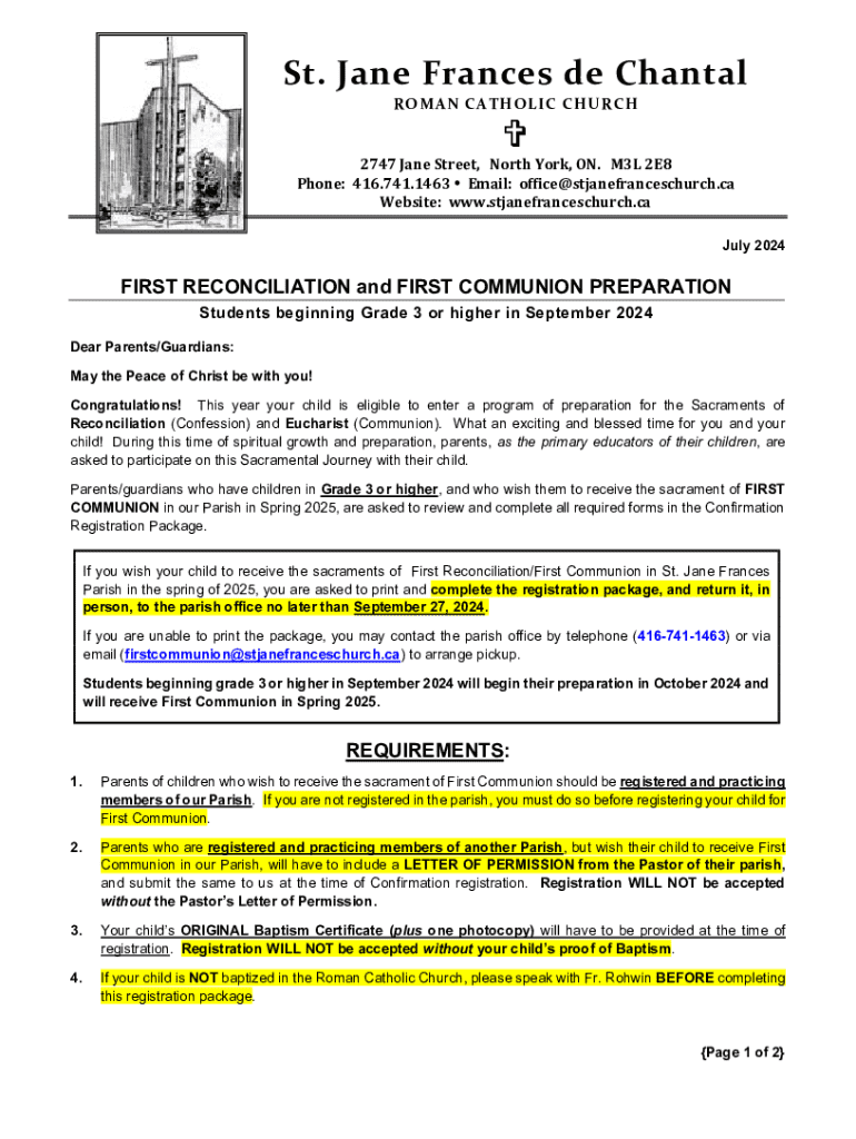 Register your child for First Reconciliation and First Communion preparation at St. Jane Frances Church for the 2024-2025 year. Deadline: September 27, 2024.