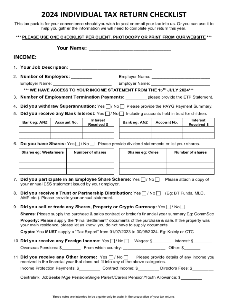 To fill out the individual tax return checklist, taxpayers should gather their income documents, deduction receipts, and personal information, then follow the structured format provided in the checklist to ensure all necessary information is included.