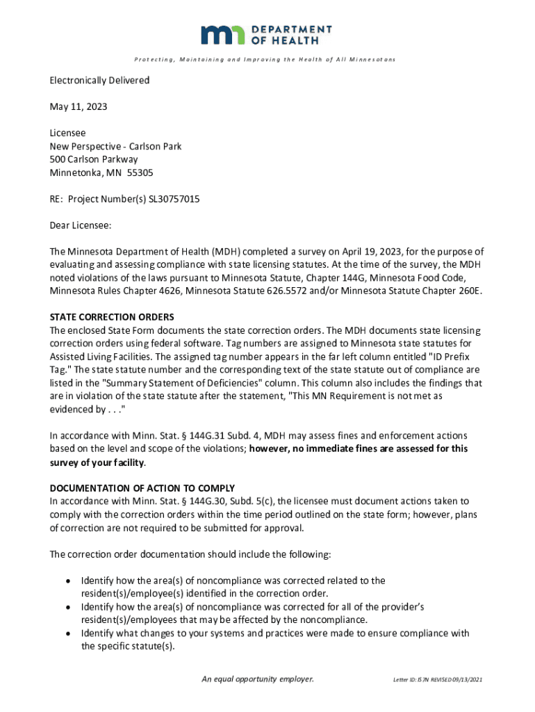 Protecting, Maintaining and Improving the Health of All MinnesotansElectronically Delivered May 11, 2023 Licensee New Perspective Carlson Park 500 Carlson Parkway Minnetonka, MN 55305 RE: Project