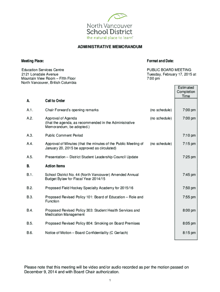 ADMINISTRATIVE MEMORANDUM Meeting Place:Format and Date:Education Services Centre 2121 Lonsdale Avenue Mountain View Room Fifth Floor North Vancouver, British ColumbiaPUBLIC BOARD MEETING Tuesday,