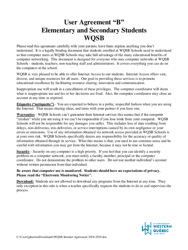 This agreement outlines the WQSB computer and internet usage policies for students. It covers acceptable use and consequences for violations to promote a safe educational environment.