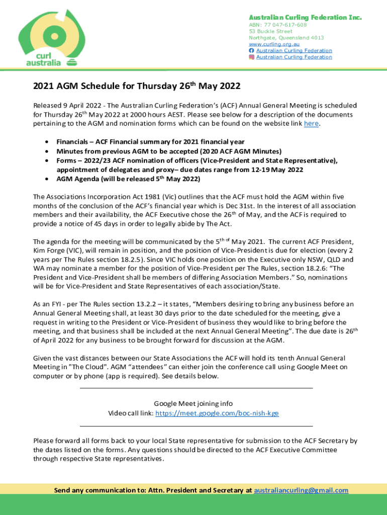 Australian Curling Federation Inc. ABN: 77 047617608 53 Buckle Street North gate, Queensland 4013 www.curling.org.au Australian Curling Federation Australian Curling Federation2021 AGM Schedule for