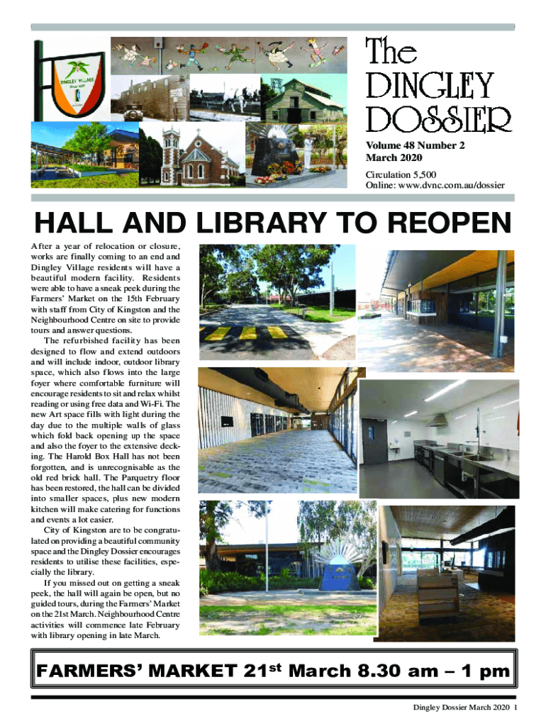 Volume 48 Number 2 March 2020 Circulation 5,500 Online: www.dvnc.com.au/dossierHALL AND LIBRARY TO REOPEN After a year of relocation or closure, works are finally coming to an end and Dingley Village