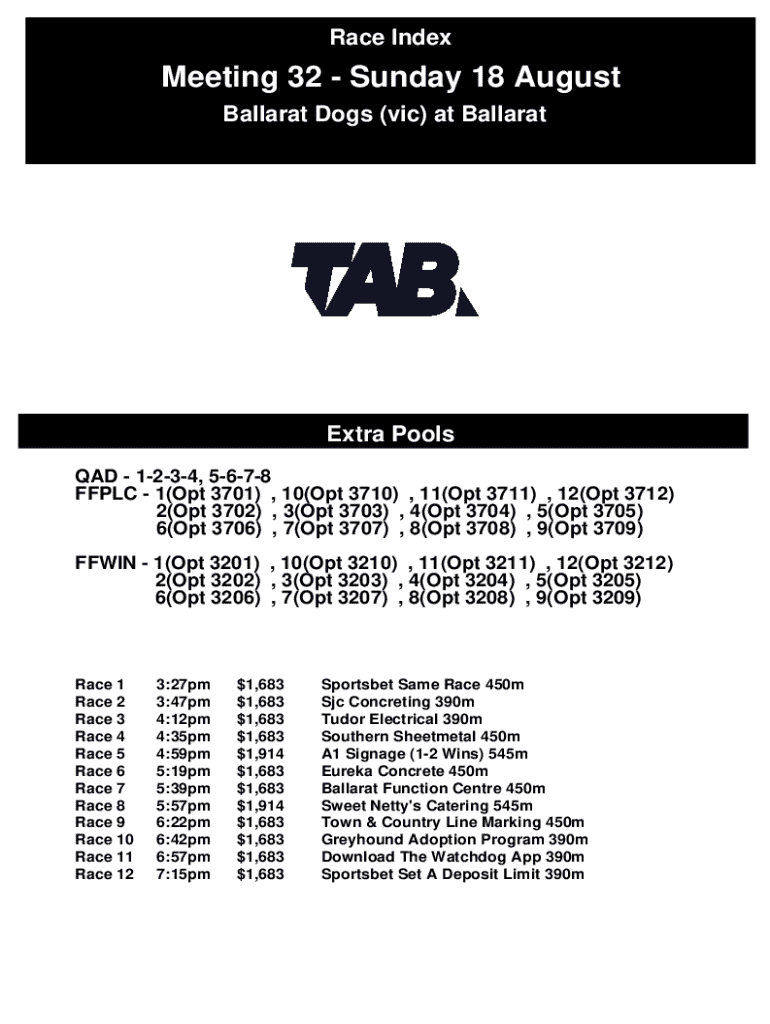 Race IndexMeeting 32 Sunday 18 August Ballarat Dogs (vic) at BallaratExtra Pools QAD 1234, 5678 FFPLC 1(Opt 3701) , 10(Opt 3710) , 11(Opt 3711) , 12(Opt 3712) 2(Opt 3702) , 3(Opt 3703) , 4(Opt 3704)