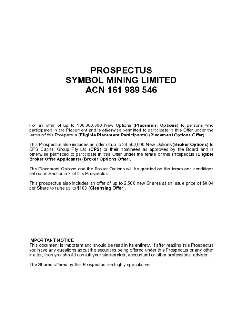 Explore the Symbol Mining Limited 2018 Prospectus detailing the offers of Placement Options, Broker Options, and Cleansing Offer, including key risks and information for investors.